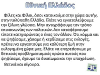 Φίλες και Φίλοι, όσοι κατοικούμε στην χώρα αυτήν, στην πολύπαθη Ελλάδα. Ελάτε να εγκαταλείψουμε την ξύλινη γλώσσα. Μην αντιγράφουμε τον τρόπο επικοινωνίας των πολιτικών. Δεν καταφέρνουμε τίποτε κατηγορώντας ο ένας τον άλλον. Ότι κόμμα και να ψηφίσαμε, χάσαμε ή κερδίσαμε στις εκλογές, πρέπει να εργαστούμε για καλύτερη ζωή στην ευλογημένη χώρα μας. Ελάτε να επηρεάσουμε με θετικούς προβληματισμούς πρώτα αυτούς που ψηφίσαμε, έχουμε το δικαίωμα και την υποχρέωση.