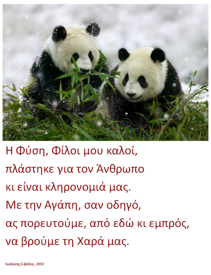 Με την Αγάπη, σαν οδηγό συντάκτης michailidis post · Δημοσιεύτηκε 31 Δεκεμβρίου, 2013 · Ενημερώθηκε 29 Απριλίου, 2017 Η Φύση, Φίλοι μου καλοί, πλάστηκε για τον Άνθρωπο κι είναι κληρονομιά μας. Με την Αγάπη, σαν οδηγό, ας πορευτούμε, από εδώ κι εμπρός, να βρούμε τη Χαρά μας. Share