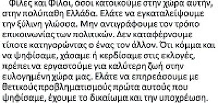 Εθνική Ελλάδος Φίλες και Φίλοι, όσοι κατοικούμε στην χώρα αυτήν, στην πολύπαθη Ελλάδα. Ελάτε να εγκαταλείψουμε την ξύλινη γλώσσα. Μην αντιγράφουμε τον τρόπο επικοινωνίας των πολιτικών. Δεν καταφέρνουμε τίποτε κατηγορώντας ο ένας τον άλλον....