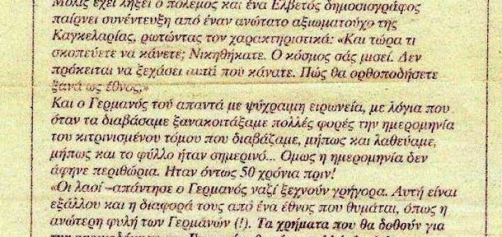 Μάριος Πλωρίτης, 1995: Η προφητεία ενός Ναζί                  Ήταν Τρίτη 9 Μαΐου 1995 όταν ο εκλιπών διανοούμενος Μάριος Πλωρίτης, συνεργάτης τότε της εφημερίδας «Ελευθεροτυπία», δημοσίευε το κάτωθι εκπληκτικό κείμενο. Όσο και...